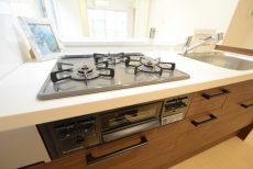 浄水機能付きの水栓、3口のグリル付きガスコンロがありますね。