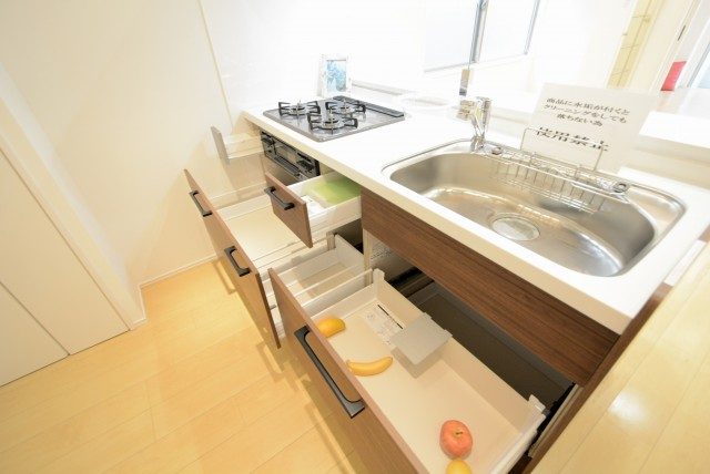キッチン収納も充実しています。上下に収納バッチリ!下の引き出しタイプの収納は深さもあり大きなお鍋もスッポリと。引き出しタイプは何がどこにあるかもみやすく仕切りを自分流につけたり工夫もできそうですね。食事をしたあとのまったりタイム、食器洗乾燥機があれば家事の時短ができ家族とまったりタイムが増えますね♪
