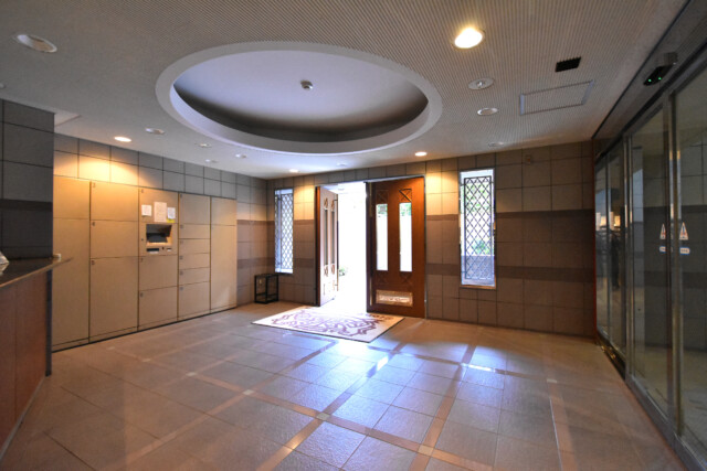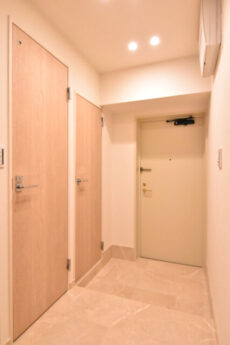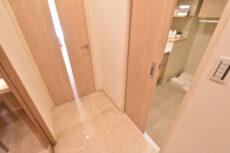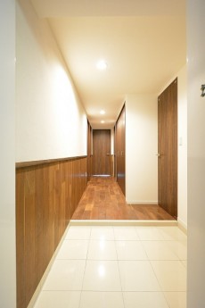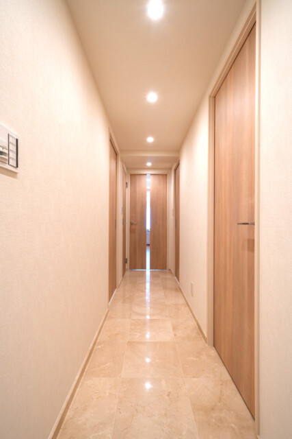 玄関から廊下にかけては高級感のある大理石貼り。冷たい感じになりがちな素材ですが、建具に合わせた暖色系でまとめることで温かみのある雰囲気に仕上がっています。収納力抜群のシューズインクローゼットが設置されているので玄関もスッキリ保てそうですよ。