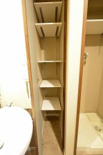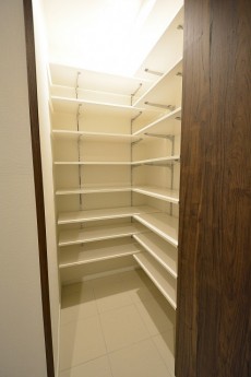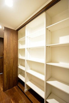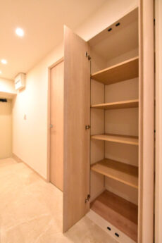 工事中にお邪魔した時より棚が付いた分狭く感じるとはいえ、まだまだ広い収納です。靴以外にもベビーカーやキャリーバッグなど置いておくこともできそうですね。さらに、廊下中ほどには生活用品や食料品のストックに使える収納棚が設置されています。