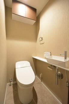 トイレはタンクレス&温水洗浄機能一体型。手洗いカウンターが付いていて高級感がありますね。トイレットペーパーのストックや掃除道具を入れておくのに便利な吊戸棚も付いています。