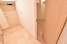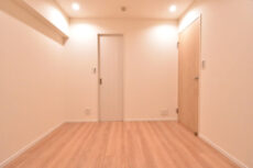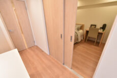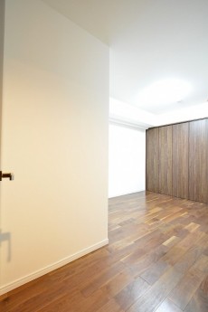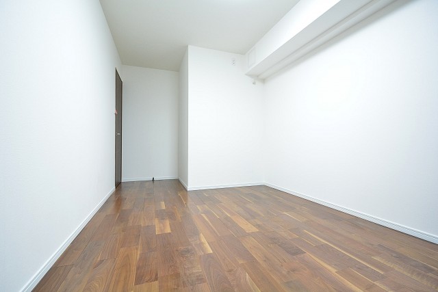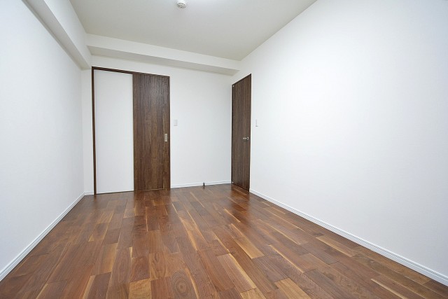 キッチン横に位置する窓のないお部屋です。他の洋室に比べると多少コンパクトながら、柱などの出っ張りがないことや入口に開け閉めのためのスペースが不必要な引き戸を使用することによって、寝室として十分な広さを確保しています。