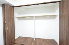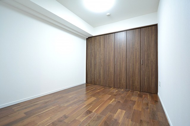 壁一面の多くなクローゼット。建具もフローリングと同じ色合いに統一されています。