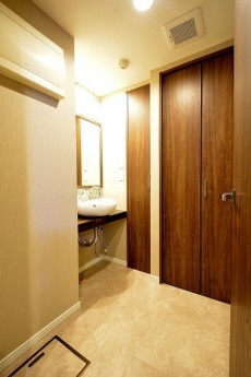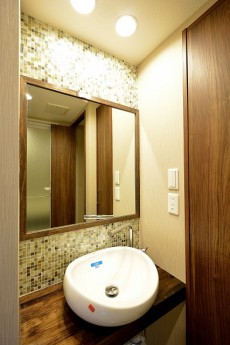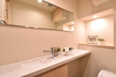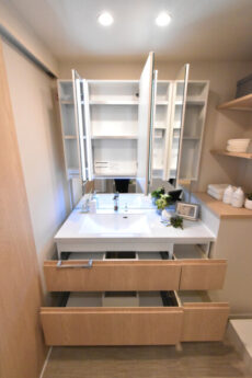洗面化粧台は四?面鏡付き。造りとしては三面鏡+1といった感じです。三面鏡の間には照明が付けられているので鏡を開いても影になったりする心配はありませんよ。二人くらいなら並んで使えそうな余裕のサイズも嬉しいですね。