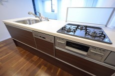 設備は3口ガスコンロ、浄水器一体型水栓や食洗機も付いていて充実しています。