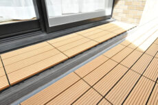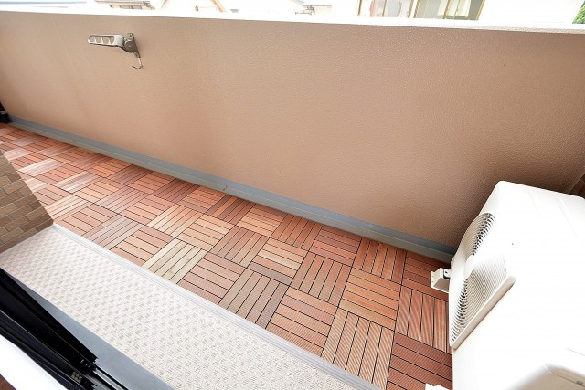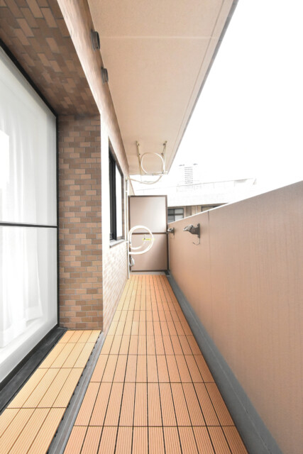 広さ9.59㎡、南東向き。きれいにデッキパネルが敷かれたバルコニーです。畳まれた状態なのでわかりづらいですが物干し金具も付いていますよ。南東向きなので干すなら午前中からがお勧めです。