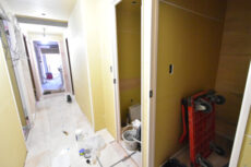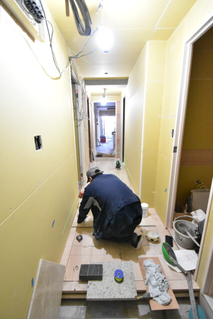 石素材は冷たい印象になりがちですが、建具の木目とよくあった柔らかな色合いが温かみのある雰囲気を創り上げています。これが職人さんが一枚一枚貼っていた大理石だと思うとちょっと感動的ですね。今、頭の中に「大改造!!劇的ビフォーアフター」の曲が流れています(笑)