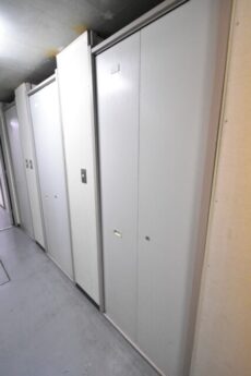 同じフロアには無償のトランクルーム。各お部屋ごとに鍵付きのスペースが割り振られています。キャンプ用品やシーズンオフの家電など入れておくのに便利そうですね。本日は鍵がなく中は見られませんでしたが2~3㎡くらいの広さだそうです。