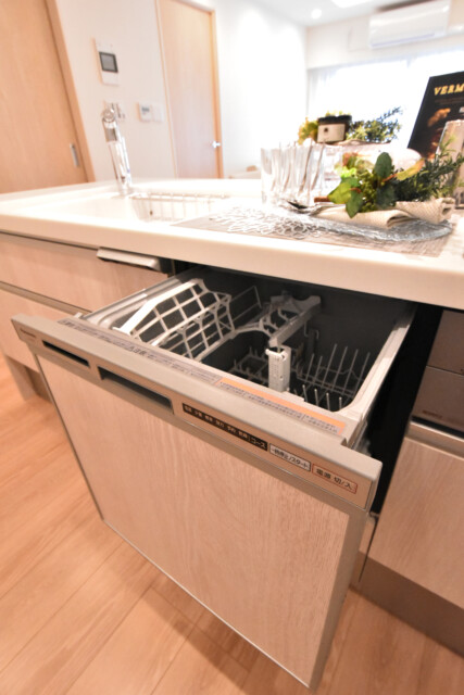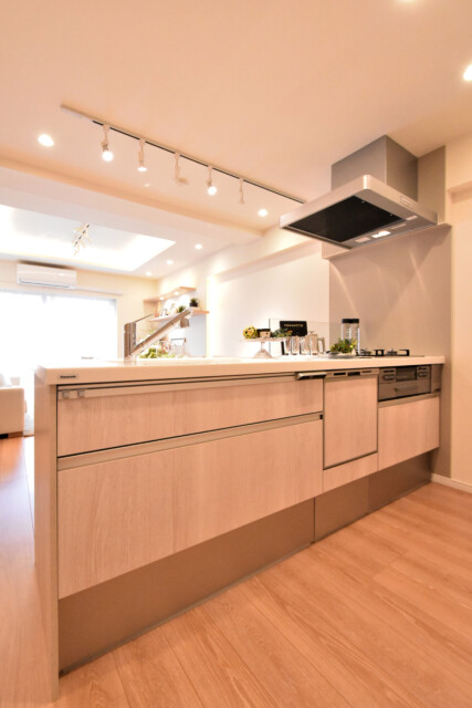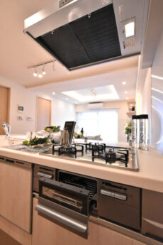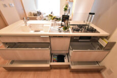 解放感がありコミュニケーションが取りやすいのが人気の理由!夕食の支度をしながらお子様の話に耳を傾けたり、お茶の準備をしながらご友人の会話の輪に加わったりと、リビングダイニングとの一体感が抜群のキッチンです。みんなの憧れ食器洗浄乾燥機付き!