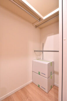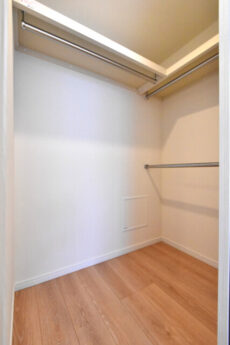 収納はウォークインクローゼット。L字型にハンガーパイプが付いた奥行きのある収納で、衣類はもちろんシーズンオフの家電やスーツケースなどかさばる物を入れておくにもよさそうです。