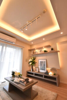 南東向きバルコニーに面したお部屋です。木目と白を基調としたナチュラルな雰囲気でとても居心地がよさそうですね。シンプルな色使いながら、壁に設置された間接照明やスポットライトなどがいいアクセントになっています。