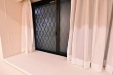 北西向きの出窓がありますが昼間でもご覧の通り。これがサービスルームの原因と思われます。ただし、眠る場所と考えれば暗いのもメリットのような気がしませんか?窓の外は外廊下ながら端に近いので人通りも少なく、とても静かですよ。