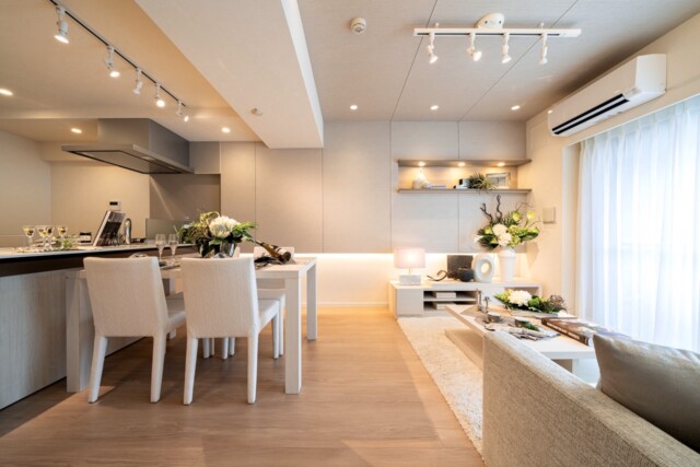 家具はディスプレイ用なので付いてはきませんが、置いてあることによって具体的な生活イメージがしやすくて助かります。ディスプレイを見ながら「リビングをもっと広くして…」とか「ダークトーンの家具を混ぜて少しモダンな雰囲気に…」とか考えるのも楽しいですよね。リビングダイニング部分には床暖房が設置されているので、エアコン暖房が苦手な方でも寒い季節を快適に過ごしていただくことができますよ。