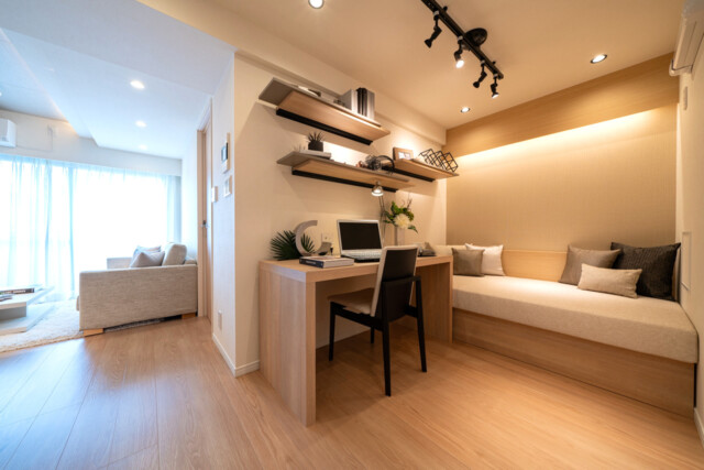 ソファベッドやデスク、飾り棚などが造り付けになったお部屋です。これだけお洒落だとガラス張りにしてインテリア代わりにしたくなるのも納得ですね。書斎として在宅ワークに使ったり、ホビールームとしてどっぷりと趣味の世界に浸ったりといろいろな使い道がありそうなお部屋です。ただし、仕事をする時はソファベッドの誘惑に注意しましょう!