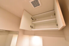洗面台の使いやすい位置にリネン庫も設置されています。