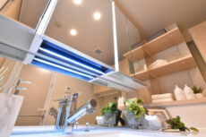 洗面化粧台のライトのスイッチは非接触タイプ。下側にセンサーが付いていて手をかざすだけでONOFFが可能です。洗う前の汚れた手や洗って濡れた手で触らないので衛生的ですね。幅が広い分収納も豊富!大きなものから細かいものまでバランスよく収納できそうです。