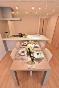 キッチンカウンターに並べて置かれたダイニングテーブルは、お料理を出したり下げ物をしたりがスムース。「これ取って~」なんて声が飛び交いそうですね。