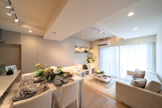 南東向きバルコニーに面したお部屋です。バルコニーに向かってキッチン、ダイニング、リビングと縦に並べるオーソドックスなレイアウトですが、幅があるので家具があってもゆったりとした印象です。