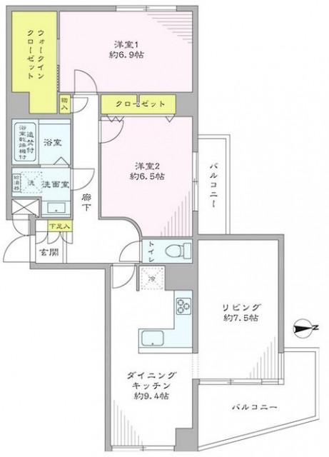左方向に長くのびている廊下側には洗面室、洋室2部屋が配置されています。