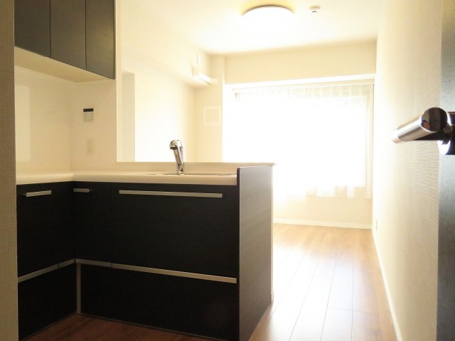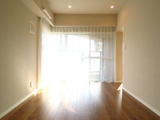 14.4帖のバルコニーに面しているリビング・ダイニング・キッチンです。ダイニングには2人用のテーブルが置いてありますが、もう少し大きなテーブルも置けちゃいそうです。