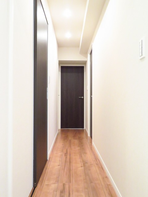 玄関をあがって右方向の廊下側へ。トイレとダイニングキッチンの扉が並んでいます。