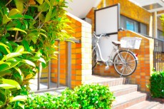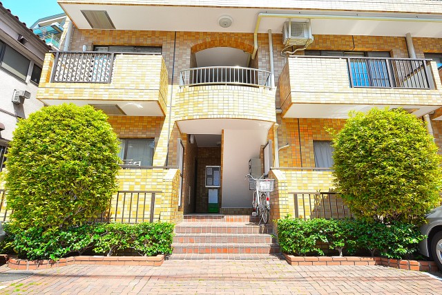 建物前面は駐車場になっていて、エントランス周りの植栽もきれいに整えられています。