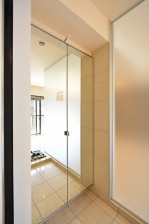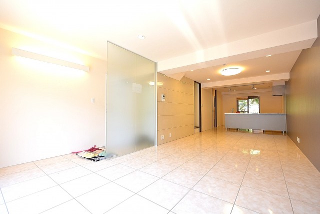 玄関からすりガラスで仕切られたリビンダイニングは約25帖と広々。