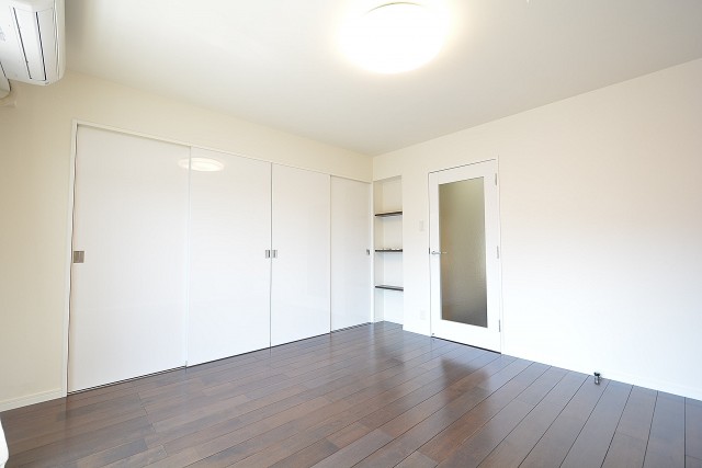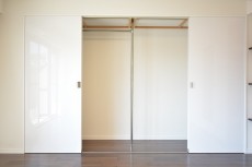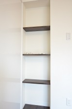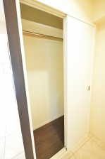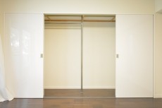 壁一面の大容量クローゼットは、上部が棚になっています。
