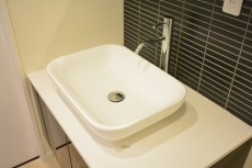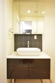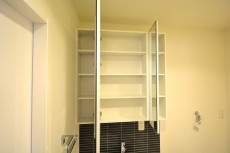 シンプルなデザインの洗面台は三面鏡の裏が収納になっています。