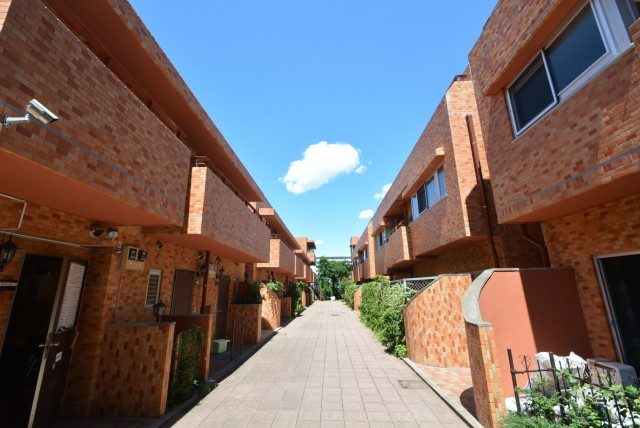 建物はA棟、B等に分かれていて、真中の道を挟んで奥まで伸びていきます。その先は行き止まりになっているので、お寺から先はこのマンションの為だけの道になっています。