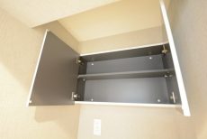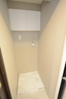 洗濯機スペースの上部には収納が付いていました。タオルなどを入れてもいいですし、洗剤などを置いてもいいですね。