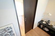 玄関の扉を開けると白のクロスにダークブラウンの扉、シャープな印象の廊下が目に入りました。思っていたより玄関は広く、廊下は短いですね。廊下は右に続いているようです。