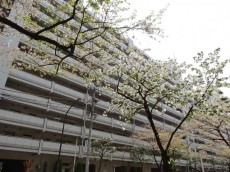 エントランス前の通りには桜が植えられており、春にはお花見も楽しめます。