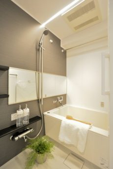 浴室は白をベースに黒のアクセントを加えたスタイリッシュな空間。