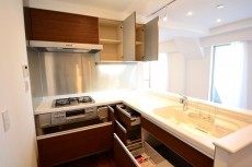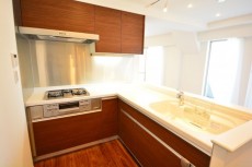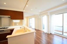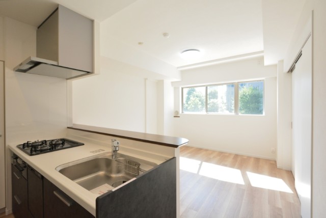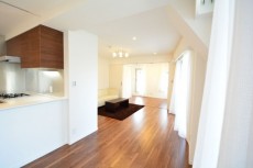こちらは約11.2帖のリビング・ダイニング・キッチン。南東向きの窓のある明るいお部屋です。キッチンを除くLD部分はほぼ正方形。ダイニング、リビング両方のセットを置くよりは、兼用の家具を置いた方がゆったりと使う事が出来そうです。