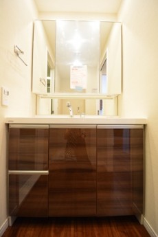 収納は洗面台下と三面鏡裏のキャビネット。細々した物が多くなりがちな洗面周りには、収納が多いのは助かります。