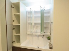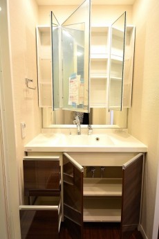 鏡の裏が一面収納になっているので散らかりがちな水まわりもスッキリ保てます。