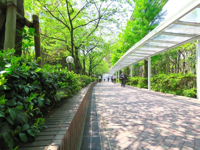 JR、都営、ゆりかもめと複数路線が利用可能。通勤・お出かけとどこへ行くにも便利なモアグランデ浜松町。浜松町駅からだと東芝ビル脇の緑道を通ってマンションまで行くことができます。車の通りもなく安全&ほぼ1本道です。緑が清々しいですね!それにしてもこのあたり、やっぱりオフィスが多いためか行きかう人はほとんどスーツを着た会社員です。