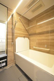 浴室は木目パネルの落ち着いた雰囲気。リラックスしたいバスタイムにピッタリです。