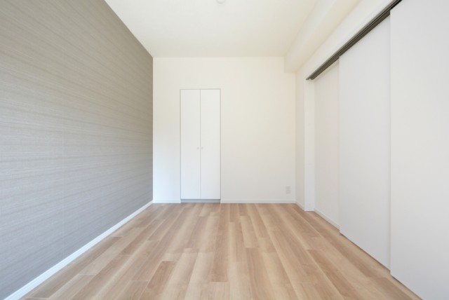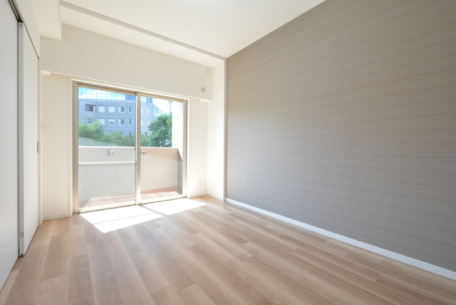 こちらは約6.6帖の洋室。グレーのクロスがアクセントになったお部屋です。LDKと同じ南東向きの窓からは、バルコニーに出られるようになっていますよ。