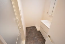 廊下を進んで右側は洗面室。洗濯機置場、洗面化粧台、バスルームがまとまっています。