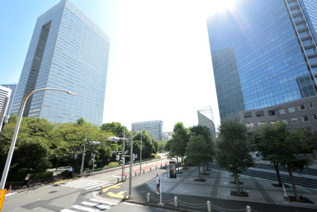 こちらがバルコニーからの様子。開放的で緑も豊富ですね♬ 右側に見えるのはツインタワーのオフィスビル、シーバンス。「N館」と「S館」の間に設けられた緑豊かなアトリウム「ア・モール」は飲食・物販・サービス施設などが入っていて、シーバンスや近隣オフィスで働く人々や地域の方々の憩いの空間にもなっています。
