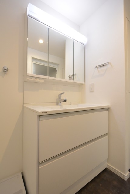 真っ白で清潔感のある洗面台は三面鏡付き。上部の照明で、鏡を使う時に影になったりもしませんよ。