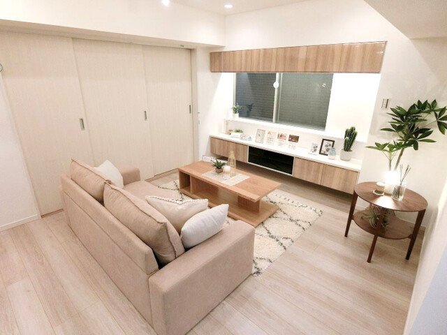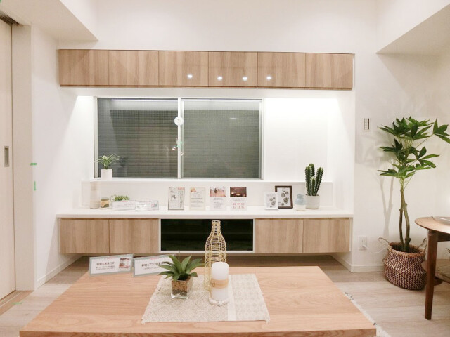 こちらの壁面にはあらかじめ家具が造りつけられています。上部は吊戸棚、下部はローボードとしてお使いいただけますよ!