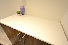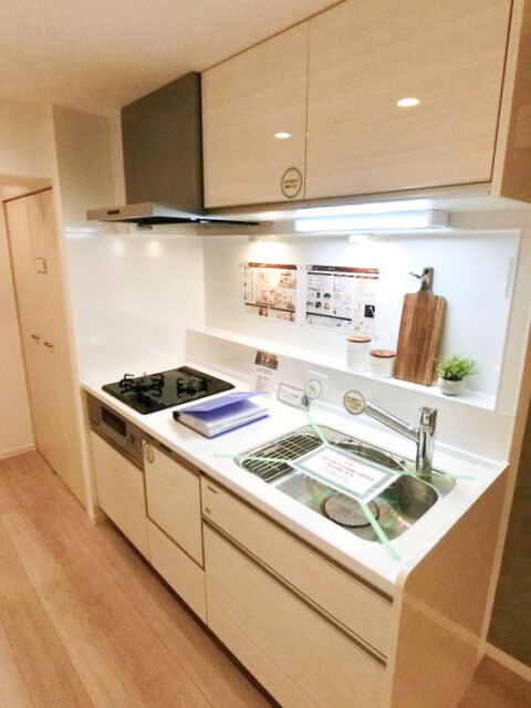 こちらがリビングダイニングの通路上になっているスペースにあるキッチンです。キッチンの前面にはニッチがあり、写真のように調味料やカッティングボードを置くスペースとしてご利用いただけます。上部には吊戸棚があるので食器等も収納できます。