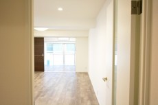 廊下の突き当りの扉を開けると、その先はリビングダイニングキッチンです。約12.6帖の広さがあります。二人掛けのソファとローテーブルを置くのにちょうどよさそうな広さ感です。