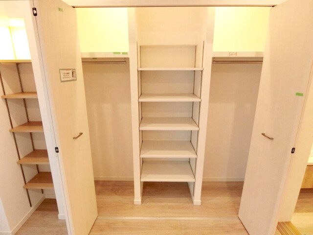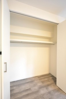 洋室の壁の一面は全て収納となっています。ご覧のようにハンガーパイプと棚が組み合わせられた収納は、掛けて収納する洋服だけでなく、たたんで収納する洋服にも便利にお使いいただける工夫が見られます。上部には照明が設置されているので手暗がりにならないのもうれしいですね!