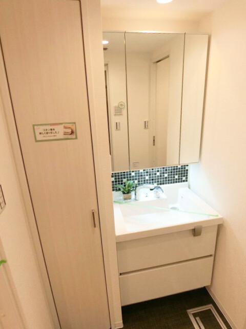 廊下を進んだ右手にある扉の中は洗面室です。コンパクトながら洗面化粧台は三面鏡付、しかも三面鏡裏は全て収納としてお使いいただけるようになっています。洗面化粧台下部も引出し収納があります。