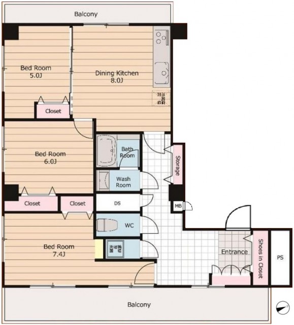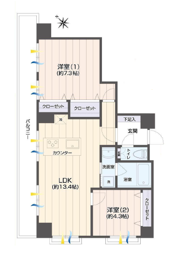 リビングダイニングを介して洗面室、キッチン、バルコニー、洋室2部屋へ行けるようになっており、壁面には各々の入口や扉がついています。順番にご紹介いたします。