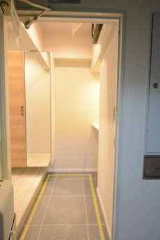 玄関を入り左側に可動棚の収納と正面にはカウンタータイプのシューズBOXが設置されています。